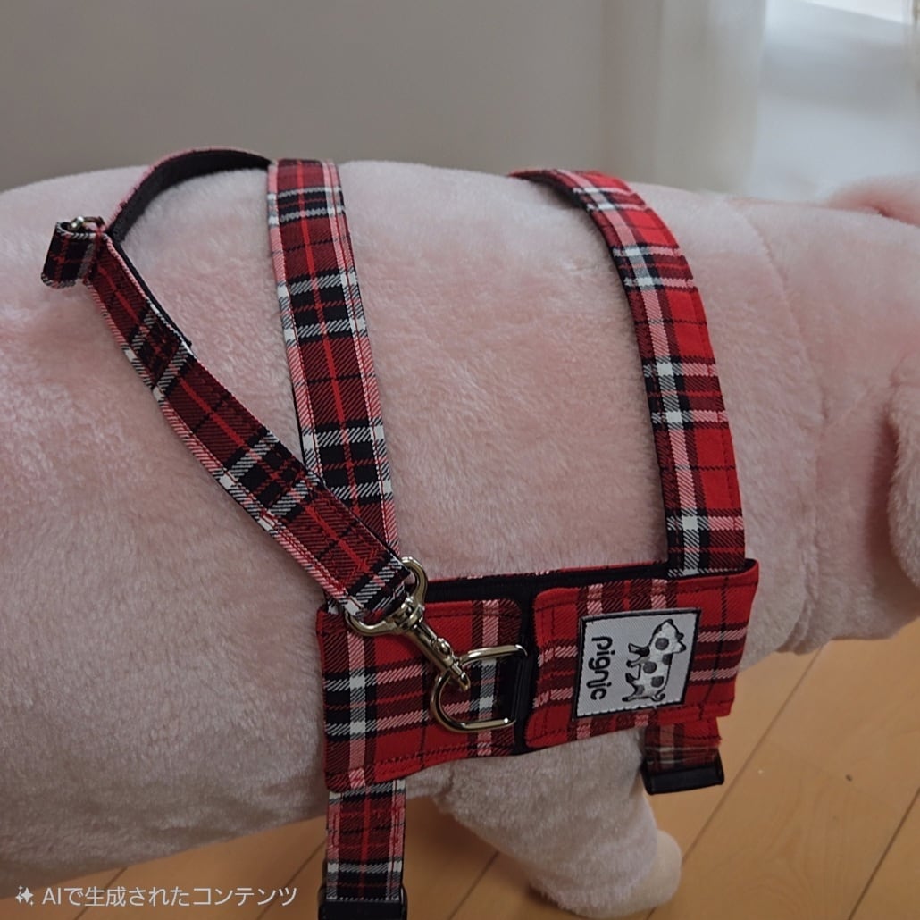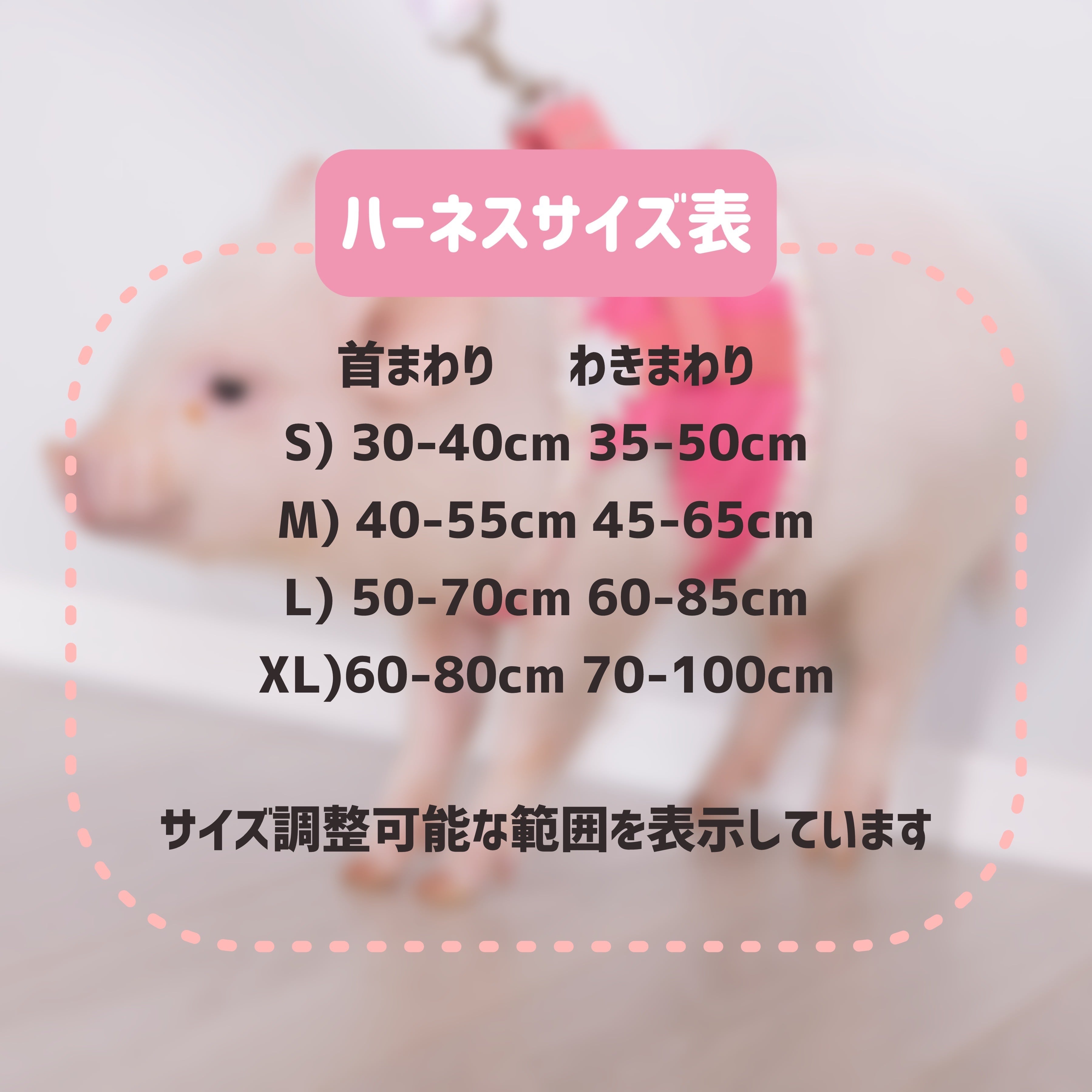 pigちゃんは首まわり、胴まわりのサイズにさほど差がない筒状の体型なためハーネスが抜けやすいリスクが生じてしまいます。サイズを体にぴったり合わせていたとしても、強い力が加わると抜けてしまう事があります。くれぐれもお散歩中は目を離されませんよう、お願いいたします。
